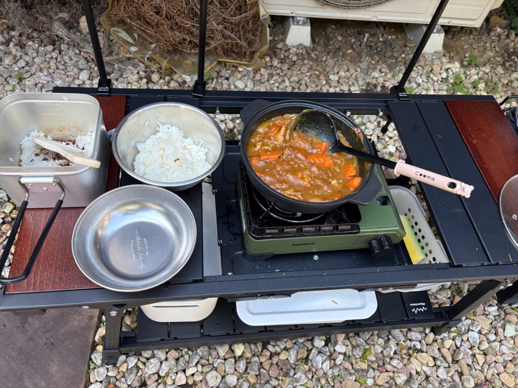 キャンプといえばカレーです。キャンプをやりだして最初はまずカレーを作りたかったのですが、食材の手配が難しく後になっていました。でも業務スーパーの冷凍「カレー用野菜ミックス」で一気に解決しました。これには人参、ジャガイモ、玉ねぎが入っています。それに冷凍「豚切り落とし」で家庭用カレーができます。