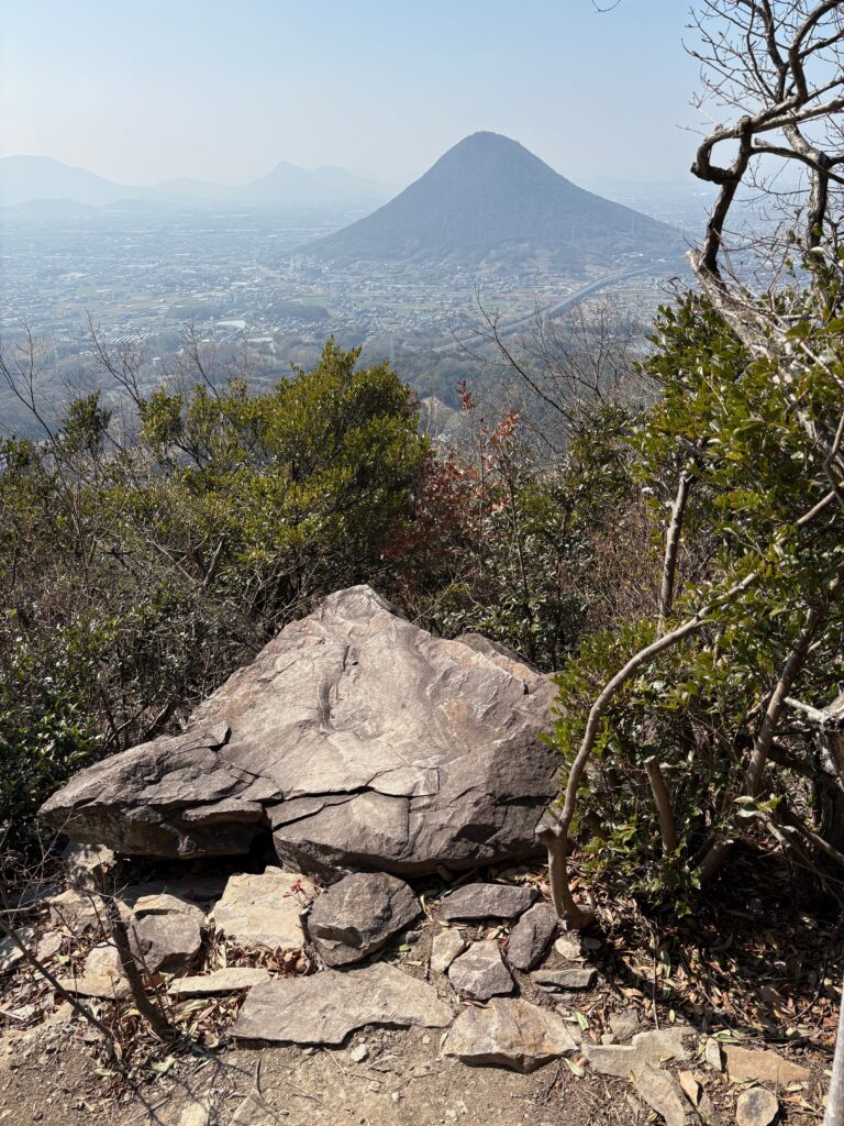 ちなみに飯野山がきれいに見える大きな岩は「タイタニック岩」という札が立っていました。確かに船の帆先のよう感じです。城山の南ルートにこんなちょっとした映えスポットがありました。