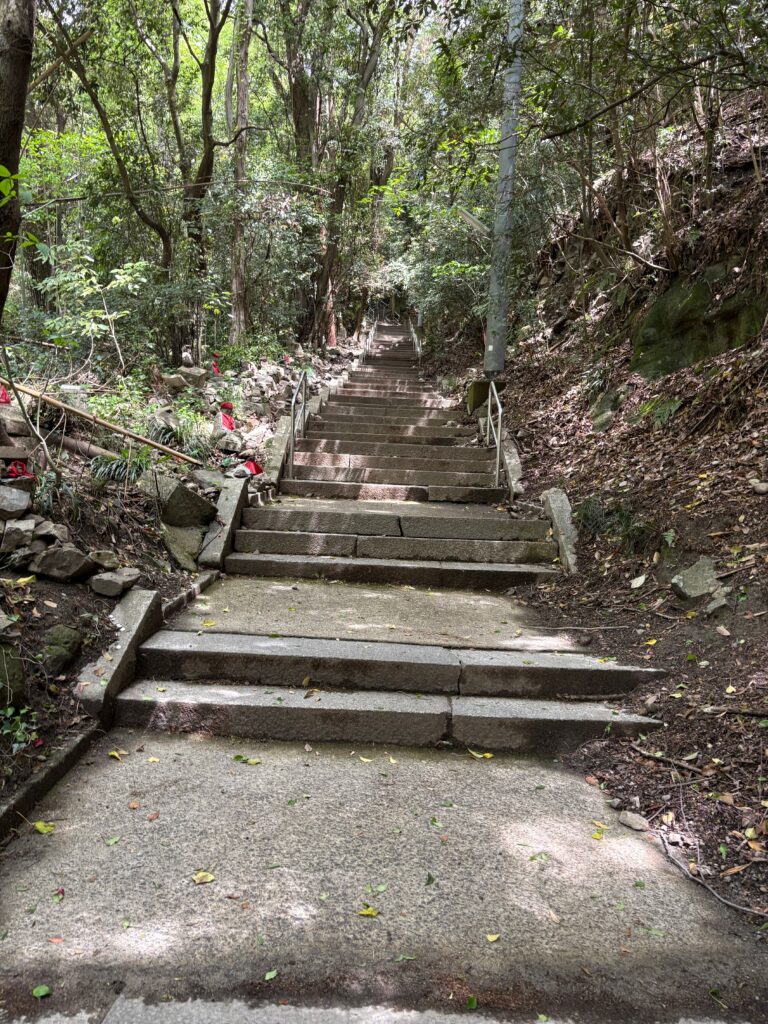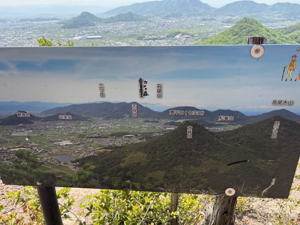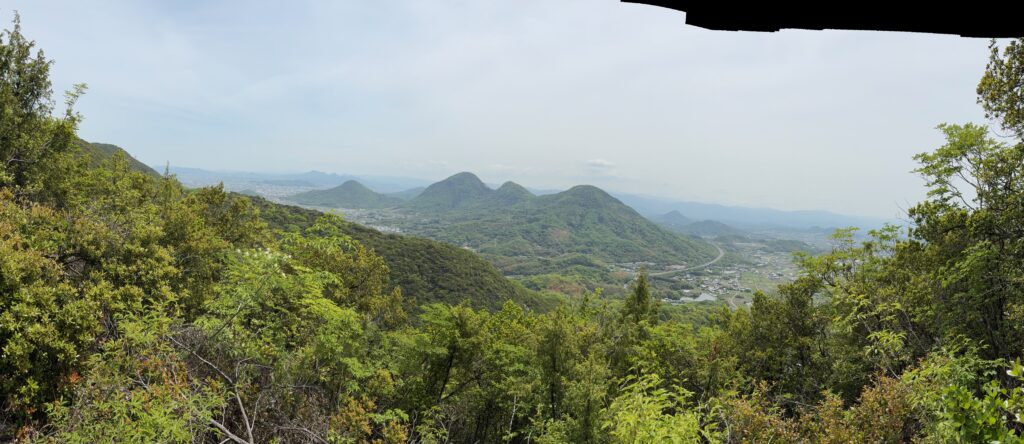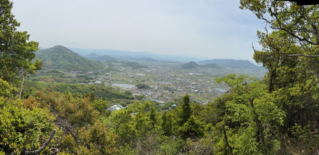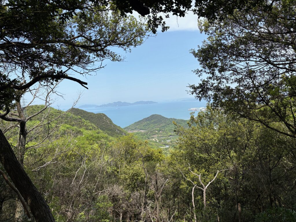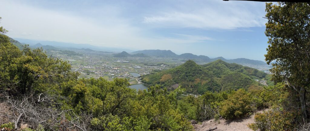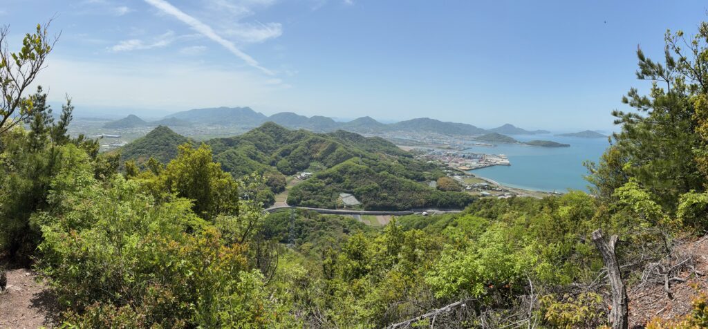 そのあとの登山は順調でした。「弥谷寺」の階段を530段上がったところで、本堂の反対側の登山道に入りました。その登山道を上り切ったら、あとは電力の鉄塔の巡視路を歩いていく感じです。最後に黒戸山に上がるときにまた登山道になりました。登山道は急登でしたが、巡視路はよく整備され適度なアップダウンがあって歩きやすかったです。途中地元の山岳会の方が木を切ってくれているビューポイントがいくつかあって楽しめました。ありがたいことです。