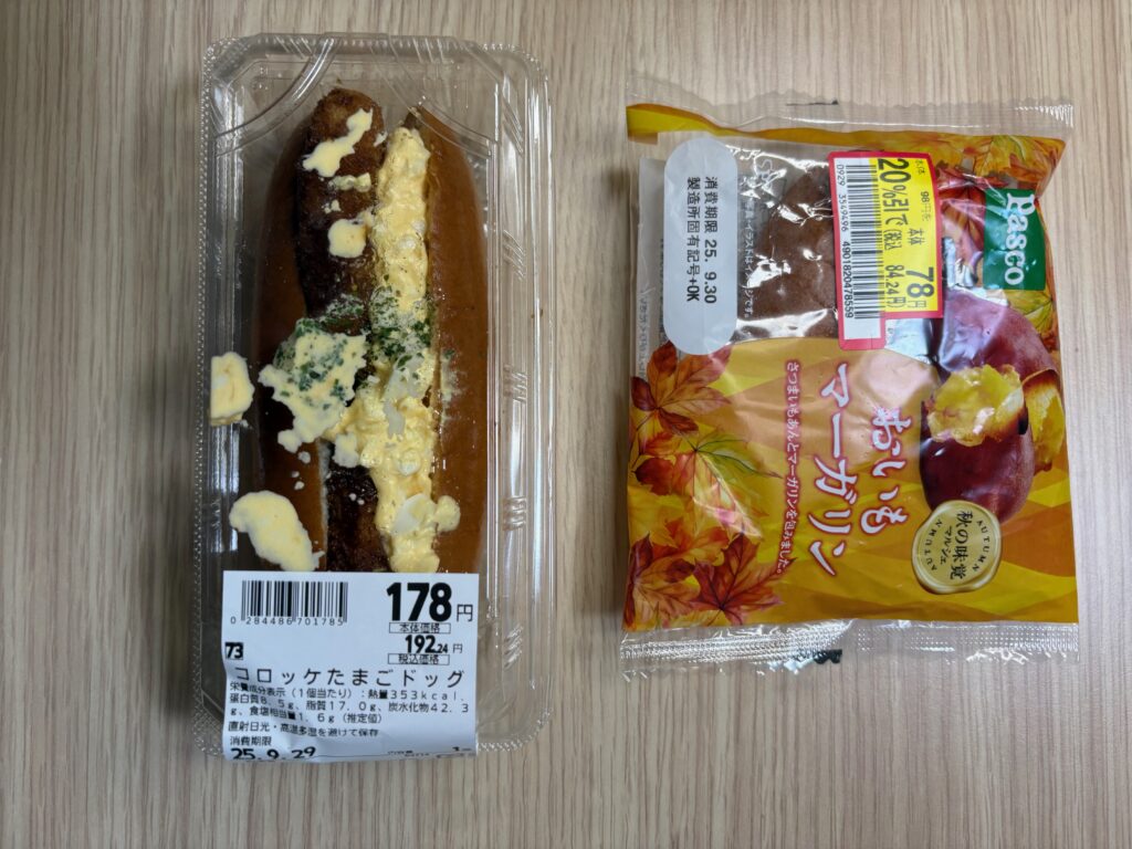お昼を食べず買い物を早めにしたので、コロッケたまごドック、おいもマーガリンが今日のお昼です。