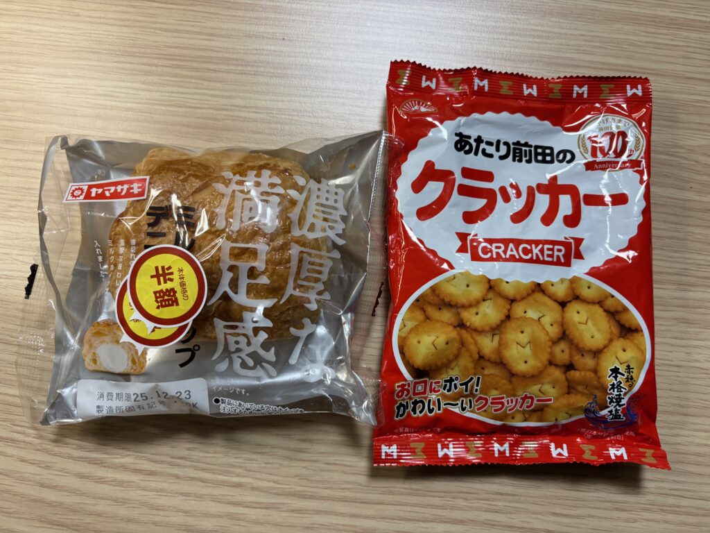 おやつは濃厚ホイップデニッシュと懐かしい前田のクラッカーが100円だったので買ってみました。