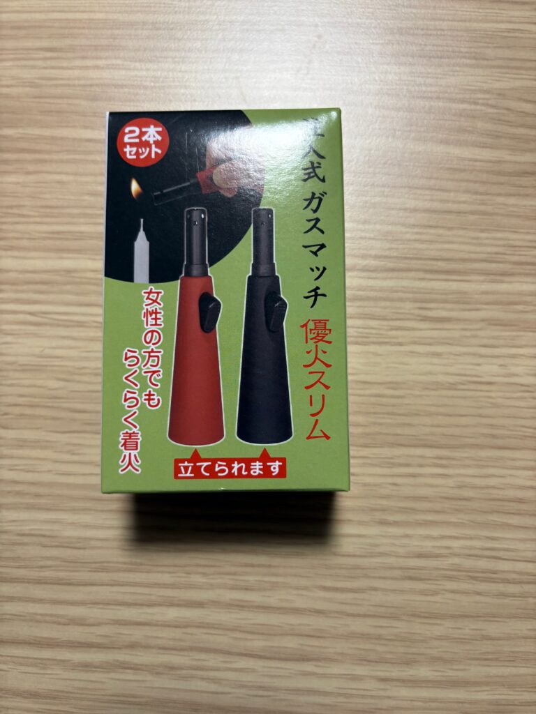 焚き火用のチャッカマンです。特徴は縦置き出来ることです。これならどこに置いても分かりやすいです。