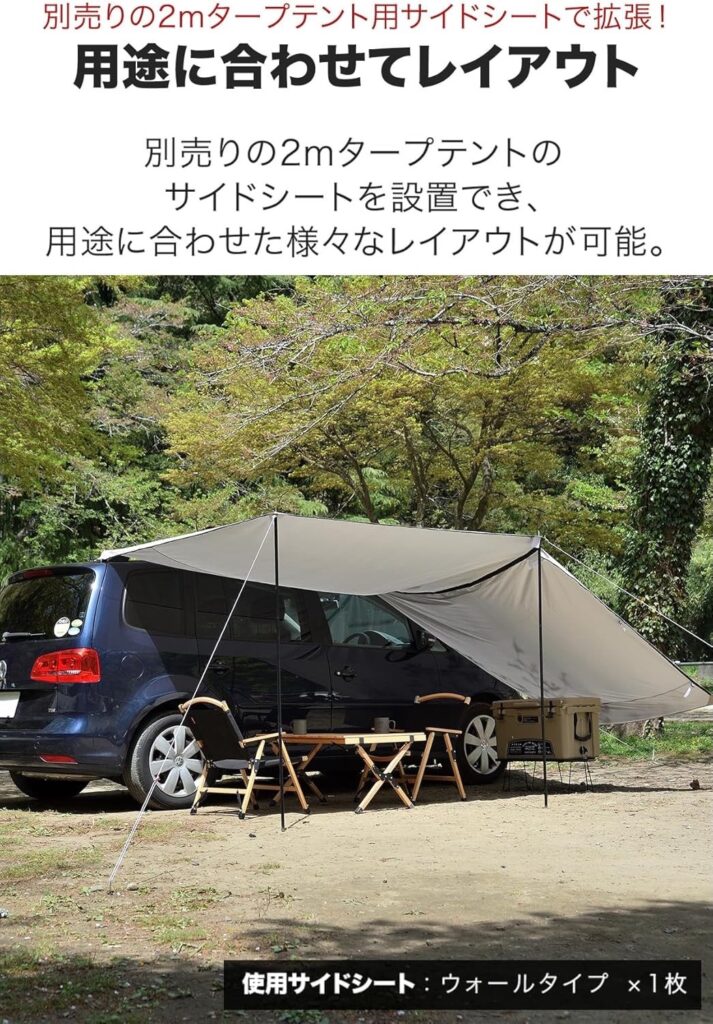 まずは車に直付けのタープは持っていますが、これから日差しが強くなるのでサイドタープを買いました。これを日差しの当たる方向に付けます。まあこれで何とか凌げるでしょう。